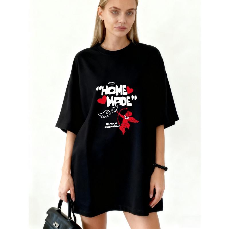 Oversized T Shirt Black Homemade With Heart And Angel Print For Casual Wear