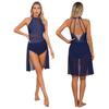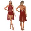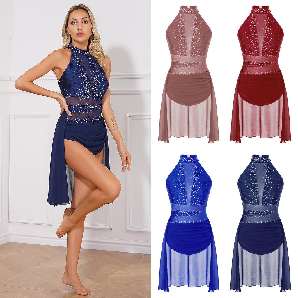 Womens Lyrical Dance Performance Costume Glittery Rhinestone Backless Dress Mock Neck Sleeveless Mesh Leotard Dresses