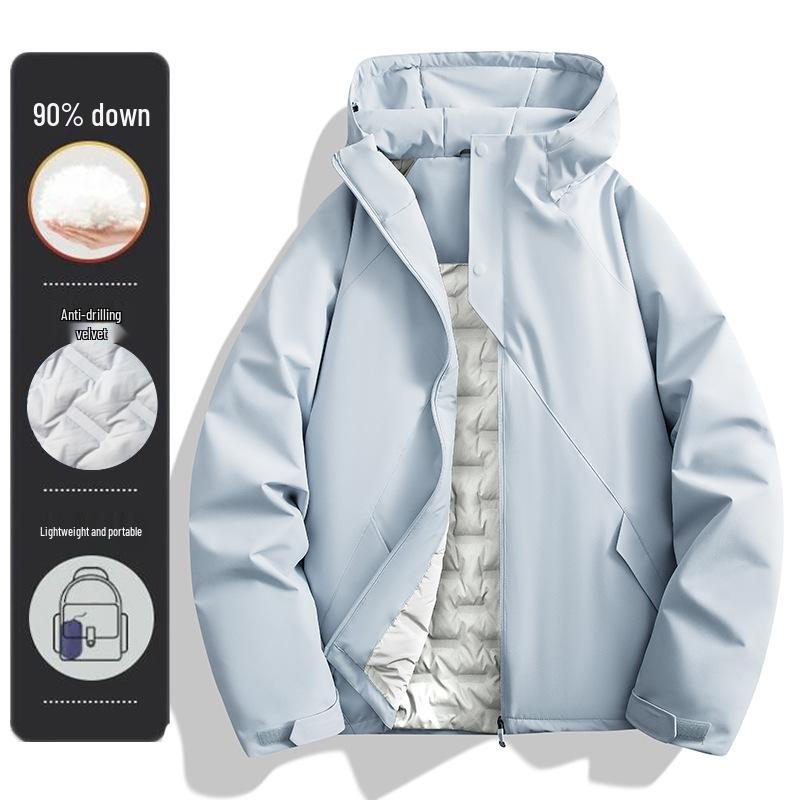 Introducing a top-tier ski jacket designed to keep you warm and stylish on the slopes. This winter hooded jacket features a thin yet effective duck down filling, ensuring optimal insulation without the bulk. Crafted with durable polyester material, it provides excellent cold resistance while maintaining a lightweight feel. The regular fit and stand neckline offer comfortable wear and a modern look, suitable for all your outdoor mountaineering adventures. The jacket is further enhanced with a polyester fur trim, adding a touch of elegance and extra protection against the elements. Specifically designed for men who seek functionality and fashion, this versatile jacket is perfect for any winter activity.