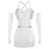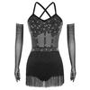 Womens Sheer Mesh Patchwork Bodysuit Dress Tiered Tassel Design Long Gloves Shiny Rhinestone Latin Dance Dress