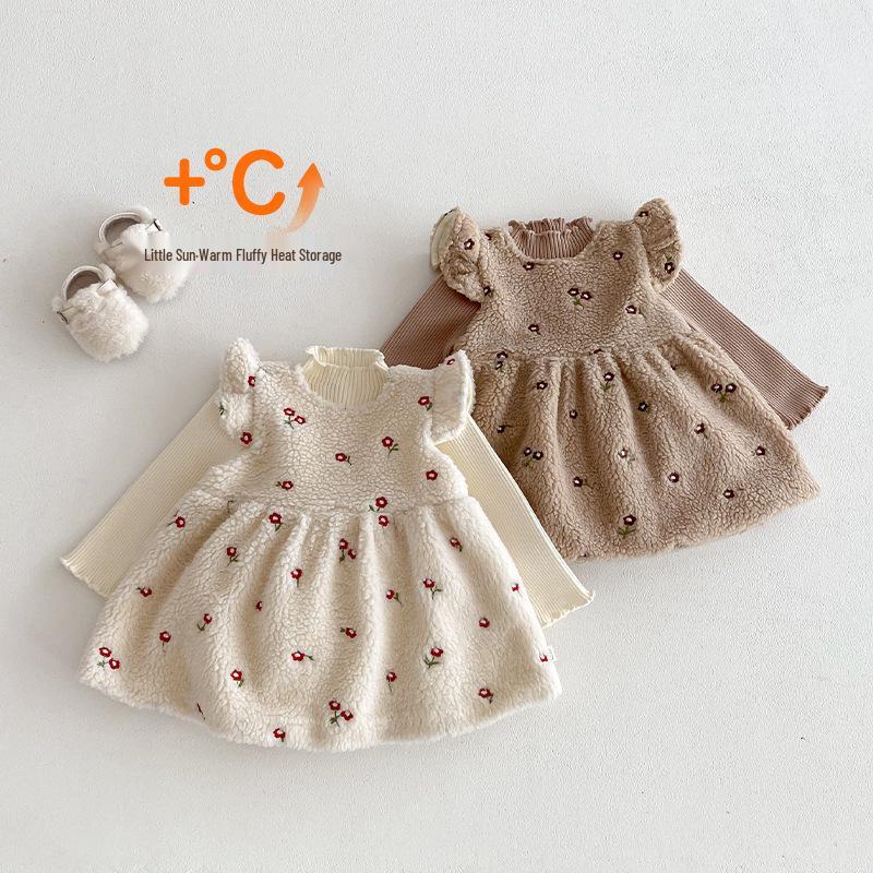 2025 Sweet Princess Winter Dress: Korean Style Flutter Sleeve with Embroidered Velvet Skirt for Girls