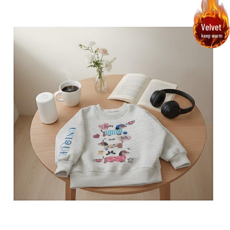 Kids' Cute Dachshund Cartoon Hoodie - Round Neck, Plus Velvet, Autumn/Winter Pullover for Boys and Girls