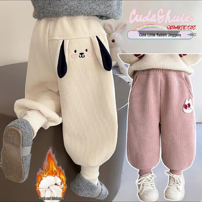 Fleece-Lined Cuffed Autumn/Winter Pants for Girls - Windproof, Warm Cartoon Design
