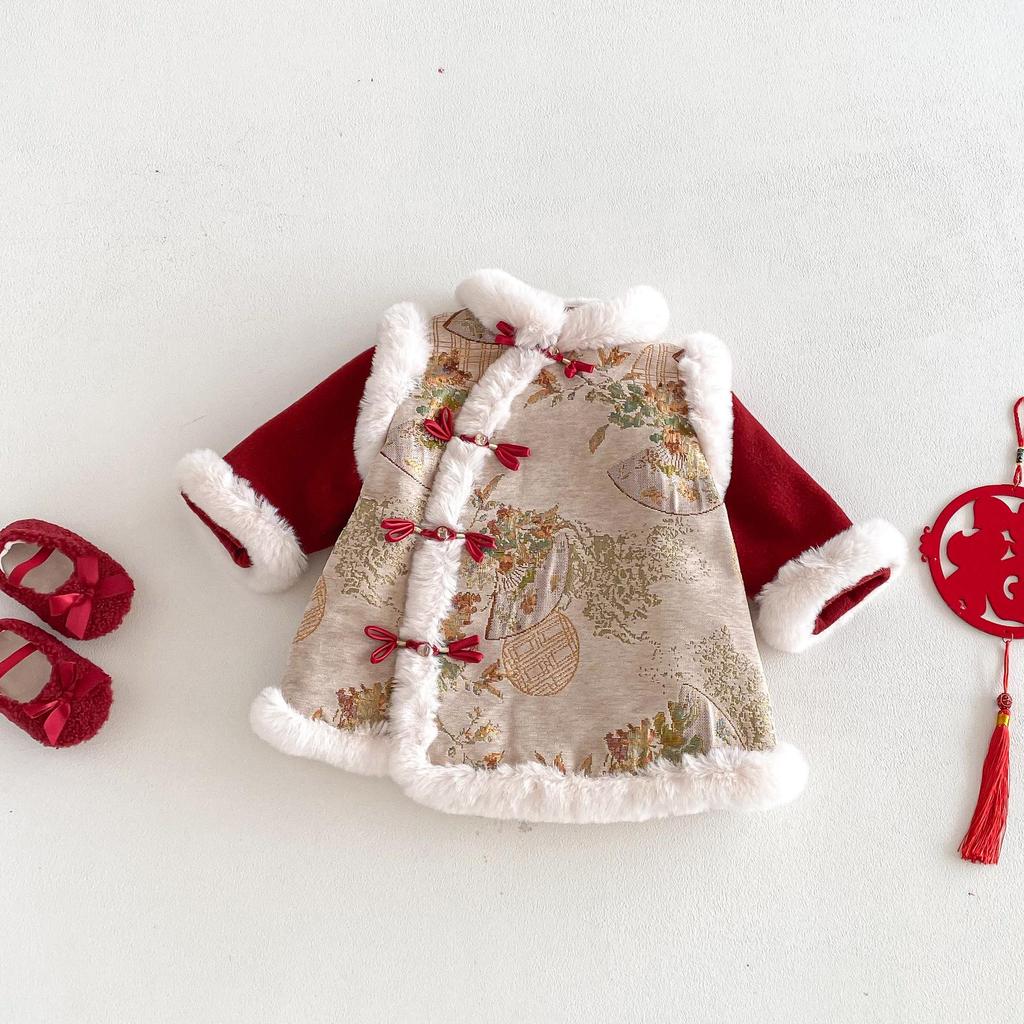 Welcome the New Year with style and charm with this adorable red retro dress, designed specifically for baby girls. Crafted from high-quality polyester, this dress ensures comfort and durability for your little one. Featuring a unique diagonal lapel design, it adds a touch of vintage elegance perfect for winter festivities. This dress is not only a festive wardrobe choice but also a beautiful keepsake for capturing those precious moments during the holiday season.