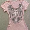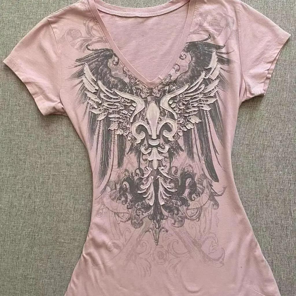 TrendHub American Vintage Simple V-Neck Pink Print Graphic Tee Short Sleeve Slim Fit Skinny Grunge Crop Top 2000S Y2K T-Shirt