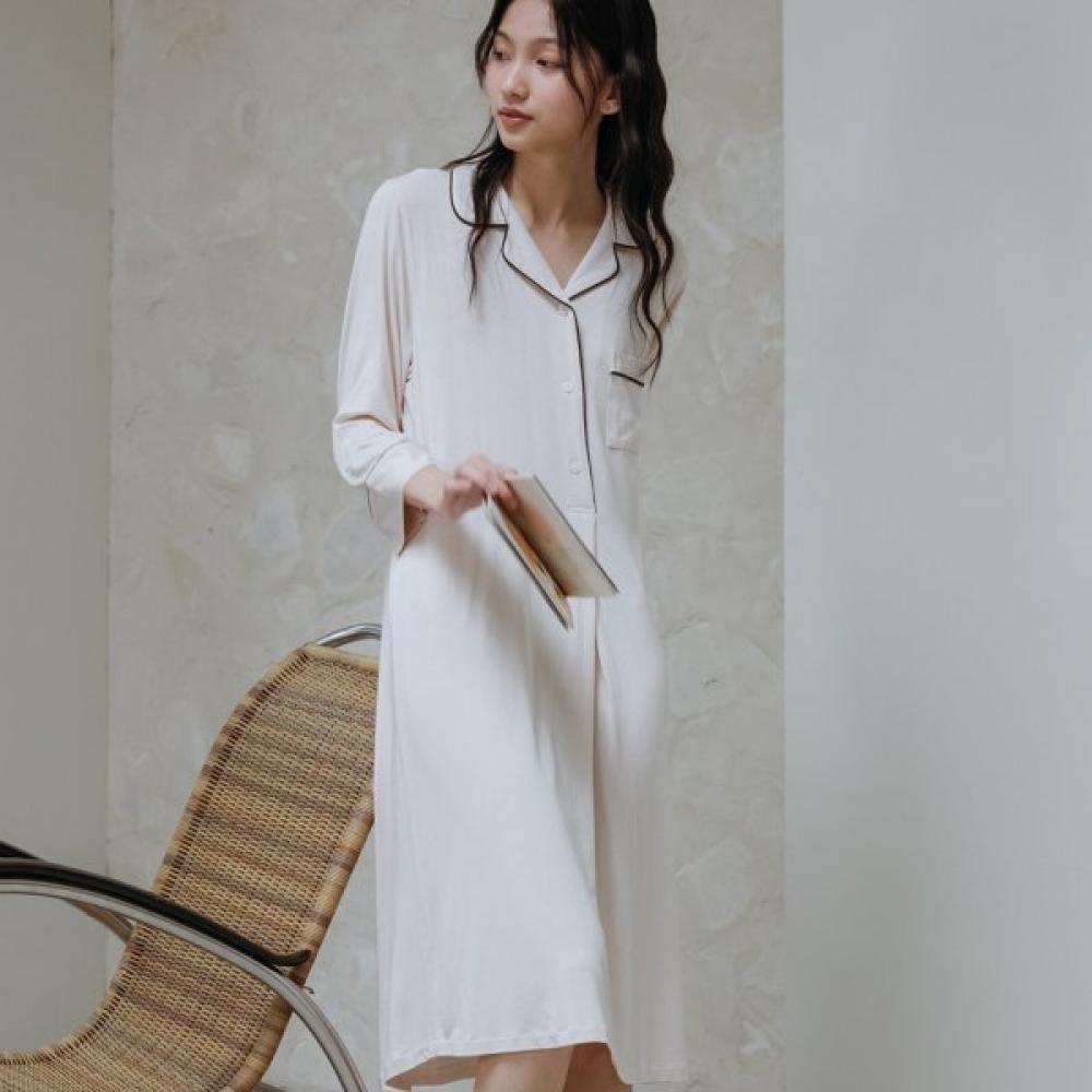 The Frenchel Micro Modal Night Shirt Peach Fuzz (FWPN068) is designed in the style of a women's night shirt dress. It features a loose fit for comfort, with a warm, cozy hue resembling soft peach fuzz. The micro modal material is suitable for both summer and winter, known for excellent breathability and moisture absorption and release capabilities.