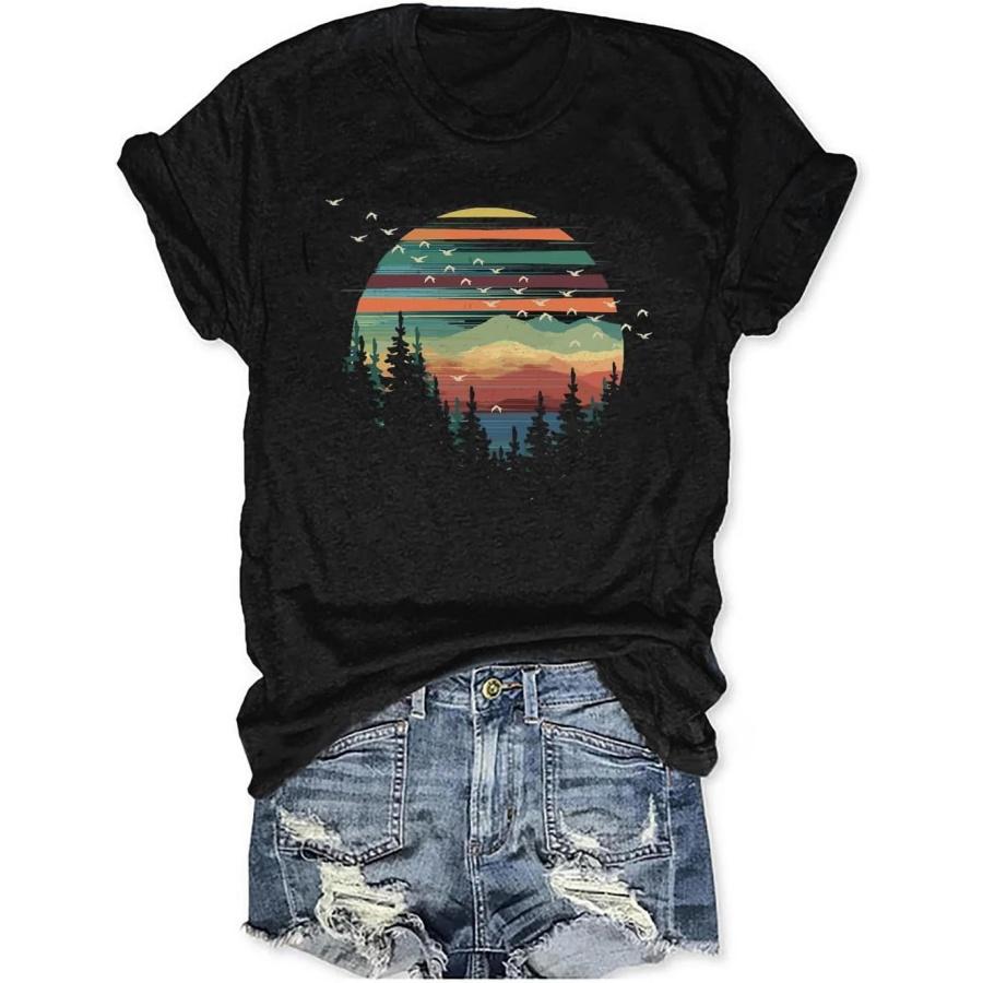 Womens Funny Heart Mountain Camping Tree Graphic Tee Forest Print T-Shirt Casual Hike Short Sleeve