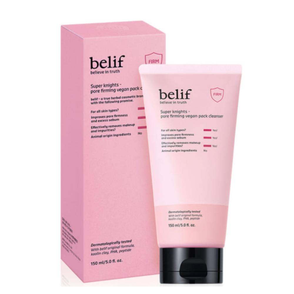 belif Super Knights Pore Firming, vegan face cleanser, 2-in-1 pack cleanser, Korean clay cleanser, pore tightening wash, vegan k-beauty, deep pore cleansing foam, belif vegan skincare, sebum control cleanser, firming facial wash, clay mask cleanser, 150ml vegan cleanser.