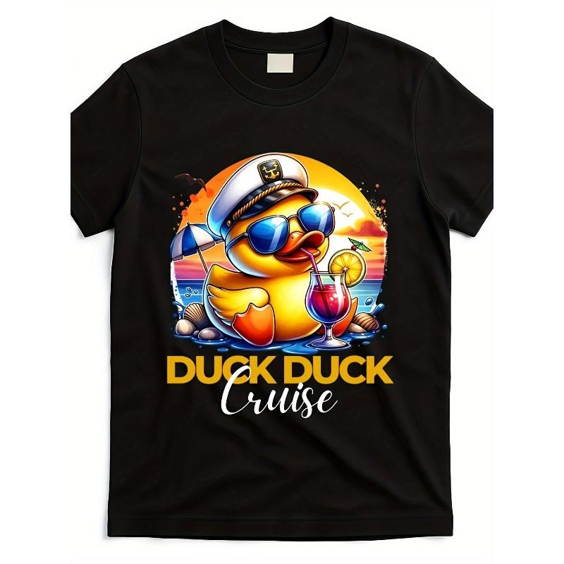 European Sizes Men's Funny Duck Duck Cruise T-Shirt - Black Short Sleeve Tee with Duck In Glasses & Tropical Drink Graphic,