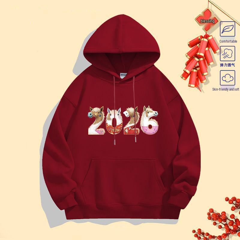This vibrant hoodie, designed with a stand neckline and long sleeves, is perfect for celebrating the Year of the Horse in 2026. Crafted from soft polyester material, it ensures comfort and durability, while the polyester fiber fur adds a touch of warmth. The loose fit makes it ideal for youth, providing both style and ease of movement. The red velvet color is festive and eye-catching, enhanced by a unique print that captures the spirit of the occasion.