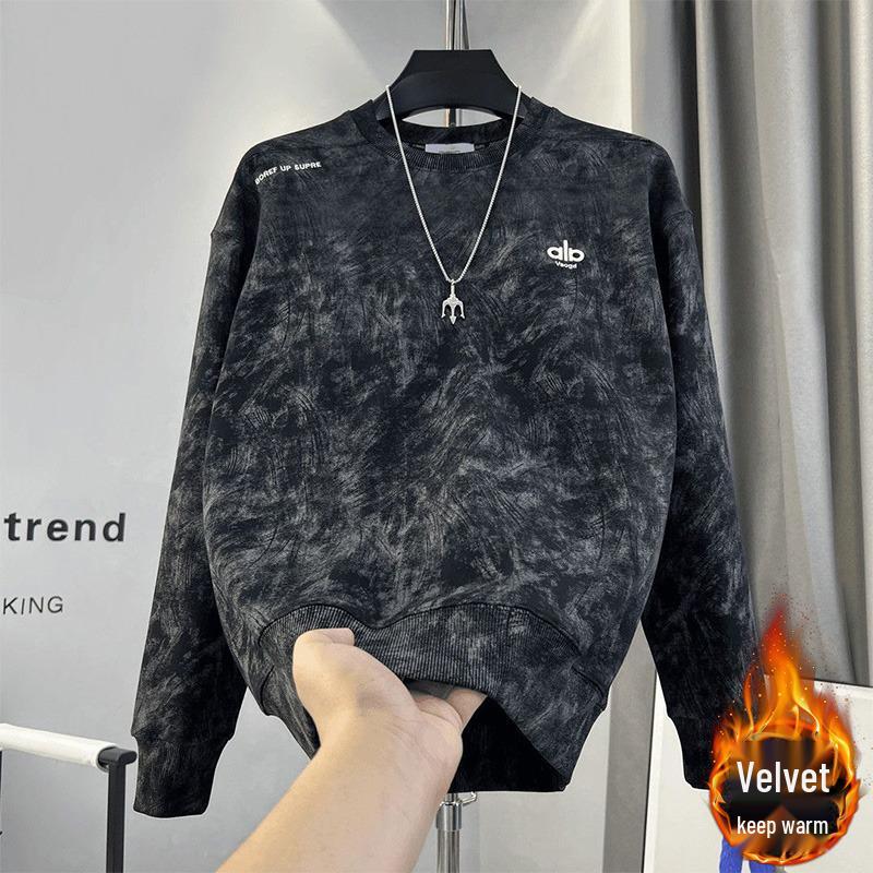 Men's Slim Fit Tie-Dye Embroidered Hoodie with Velvet, Long Sleeve, Round Neck for Autumn and Winter.
