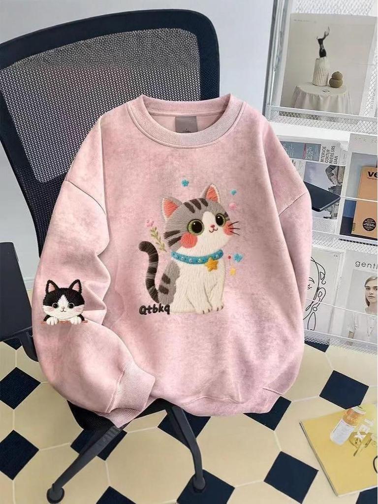 This vibrant tie-dye crewneck sweatshirt, designed for girls, features a charming cartoon cat graphic on the front. Perfect for the cooler months of spring and autumn 2025, its fleece-lined interior provides added warmth and comfort. Made from durable polyester material, it combines long sleeves with a stylish and cozy fit. Available in medium and large sizes, this sweatshirt is an ideal choice for adding a playful touch to any wardrobe.