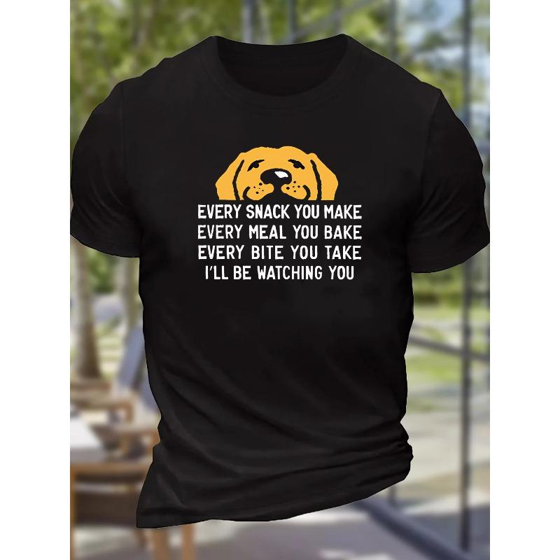 European Sizes Cute Puppy & Letter Print Men's Casual T-shirt, Short Sleeve Crew Neck Summer Top, Men's Clothing