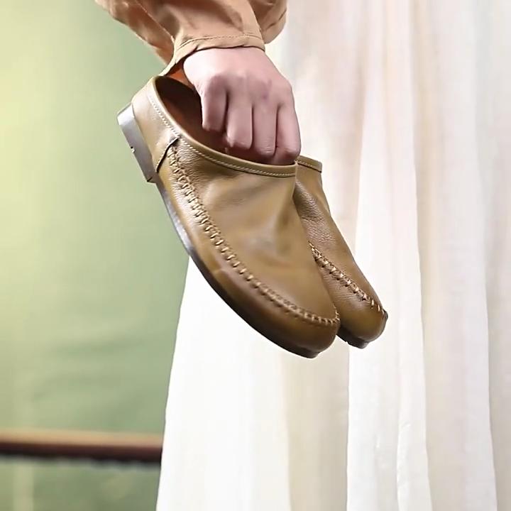 Johnature Retro Soft Soled Women's Slippers Genuine Leather Solid Color Handmade Comfortable Outdoor Slides