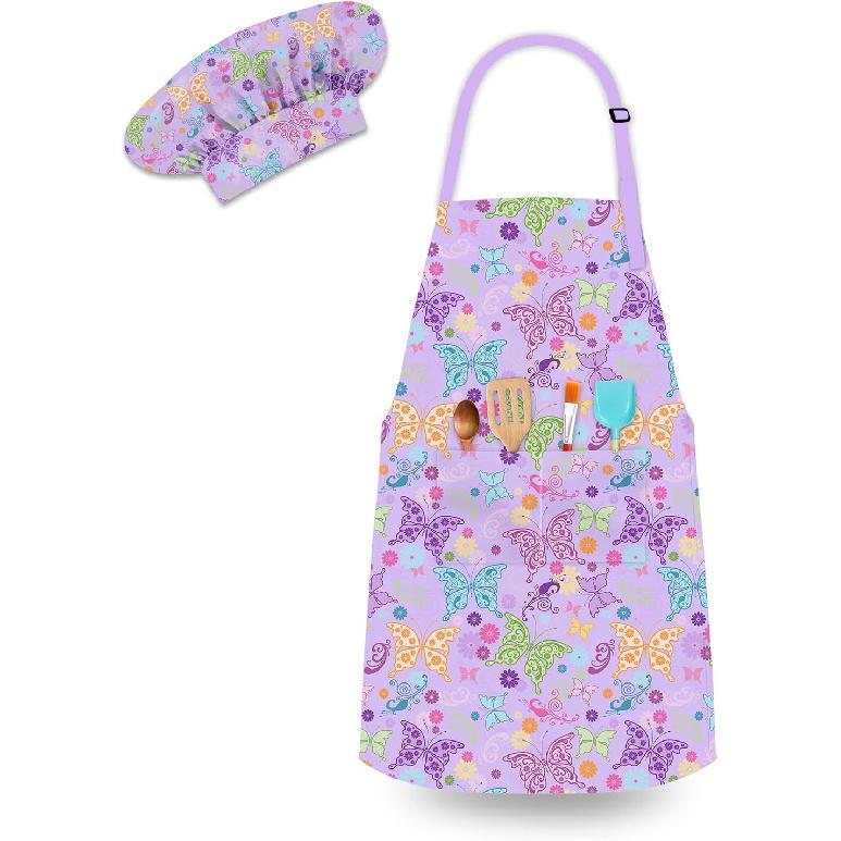 Kids Chef Hat and Apron Set with 2 Large Pockets Girls Boys Adjustable Chef Costume Kids Aprons for Cooking Baking