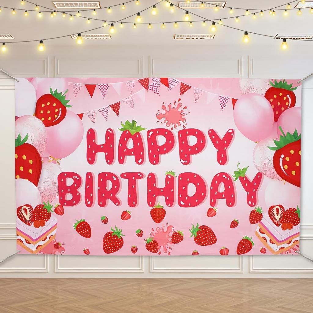 Strawberry Shortcake Happy Birthday Decorations Banner, Strawberry Themed Birthday Party Decoration Backdrop, Berry First Birthday Background Party