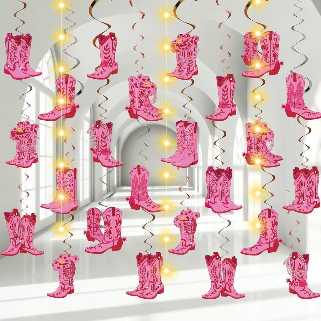 Pajean 57 Pcs Cowgirl Party Decorations with LED Light Pink Boot Hanging Swirls Decorations Western Cowgirl Boot Hanging Banner for Western Baby