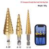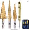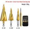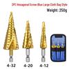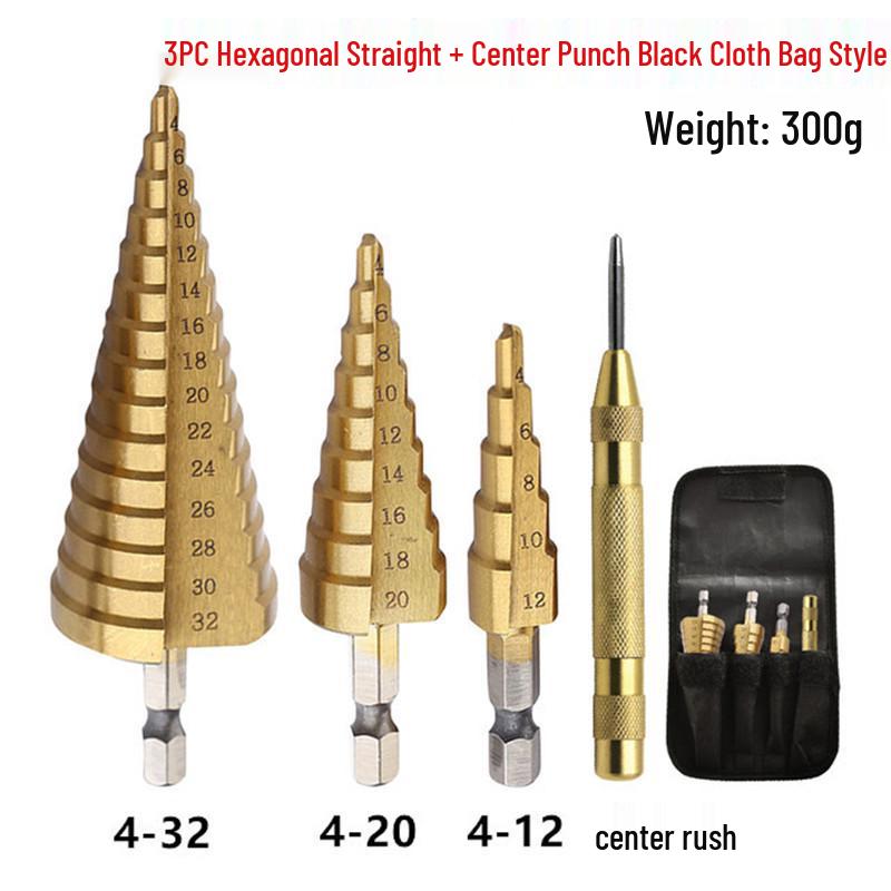 Hex Shank Step Drill Bit Set: Straight & Spiral Flutes, Tapered Hole Opener, Chamfering, with Cloth Bag Packaging.