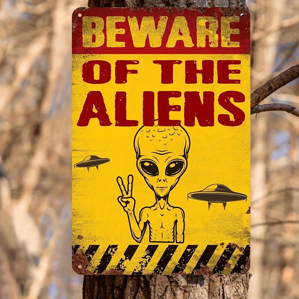 Retro Alien Invasion Metal Sign Vintage Wall Art Beware of the Aliens Design with UFOs and Alien for Bar Pub Cafe