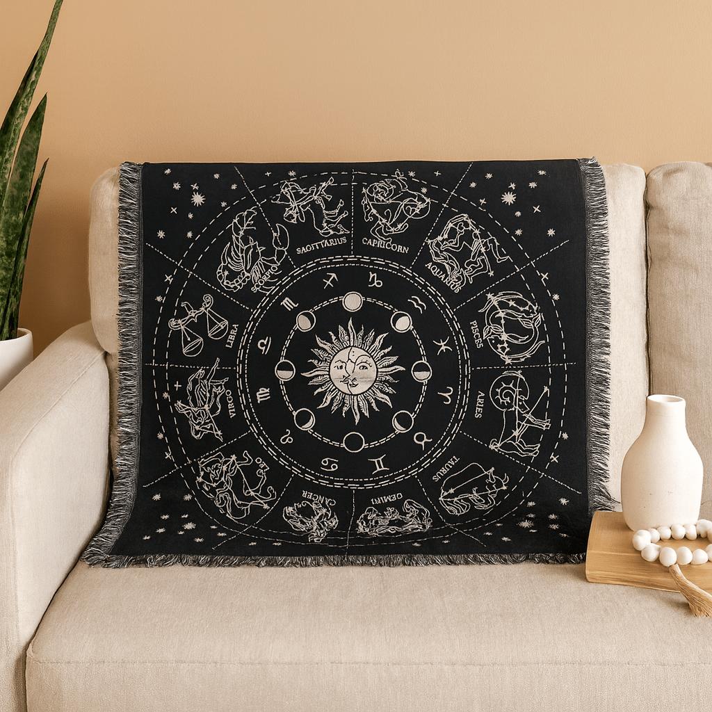 Handcrafted in India, this square cloth features a striking black background adorned with a high-contrast monochrome print. At its heart lies a stylized sun-and-moon face, encircled by the phases of the moon, offering a timeless symbol of balance and unity. Surrounding this central motif is a zodiac wheel, meticulously detailing each of the twelve signs with their corresponding glyphs and illustrative figures. The scattered stars and concentric dotted lines guide your gaze, inviting contemplation and connection to the celestial.