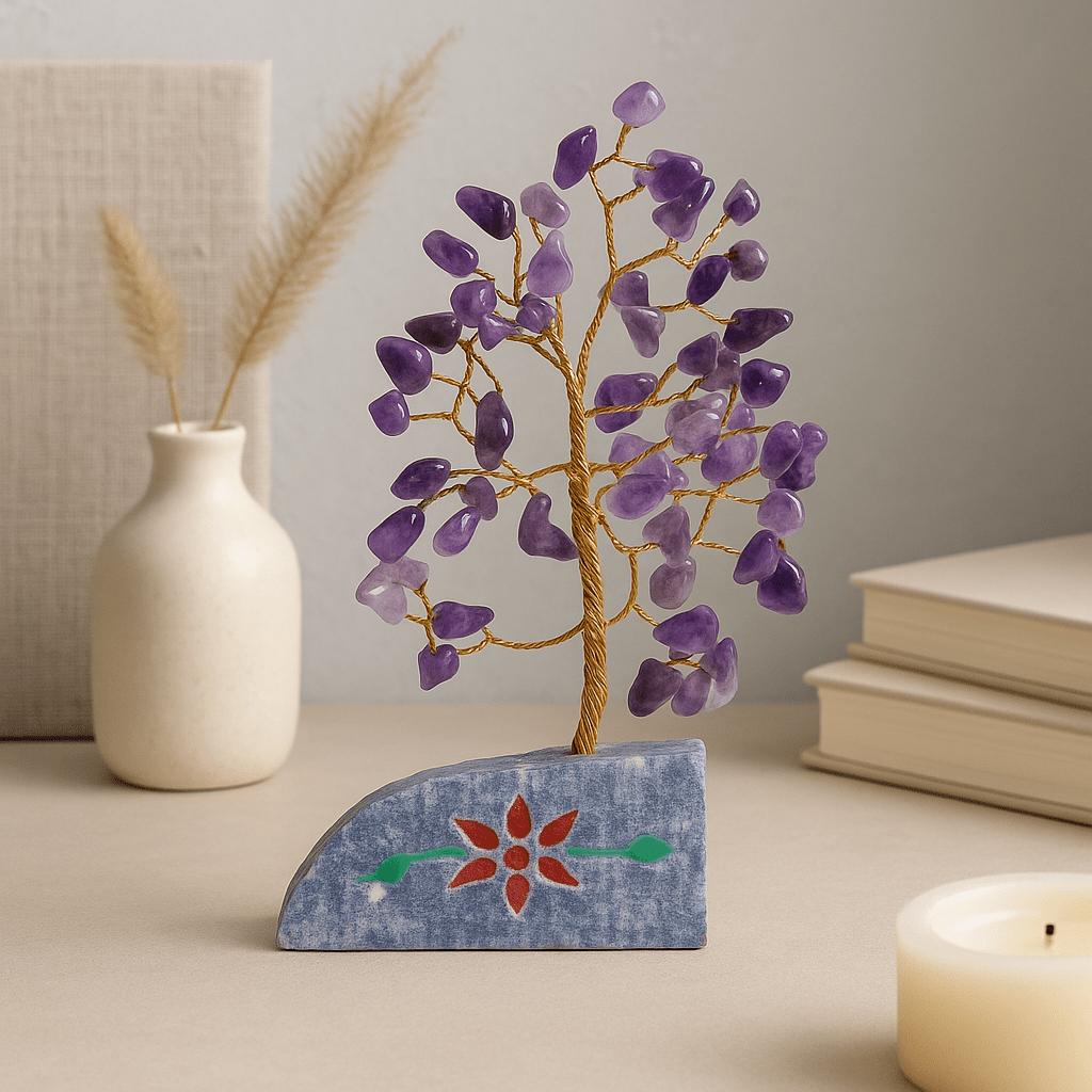 Handcrafted in India, this sculpture is made from around 80 natural amethyst chips—each irregular, semi‑translucent, and uniquely shaded from lilac to deep purple. The twisted wire trunk and branches end in tiny loops that cradle each stone; you can gently shape the branches to suit your space. The base is an irregular cut of stone with a floral inlay, offering pleasing texture and a grounded feel in the hand.