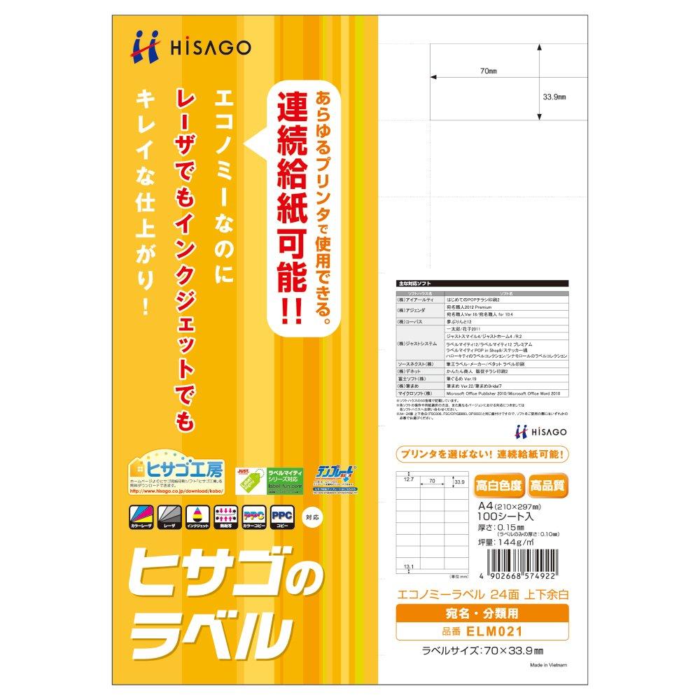 Hisago Economy Labels, 24 Labels, Top and Bottom Margins, A4, 100 Sheets, ELM021