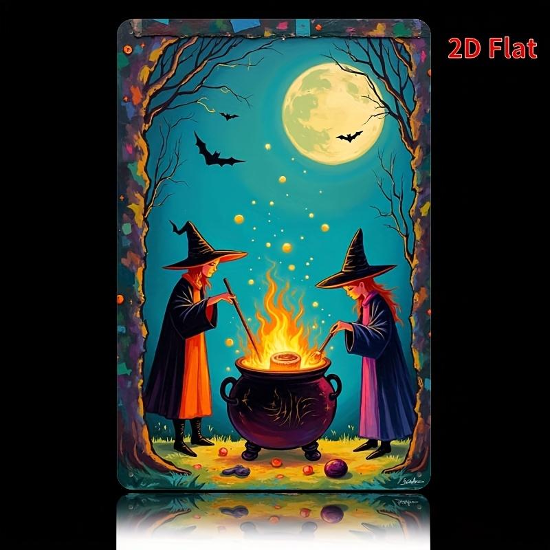 Vintage Gothic Witch Metal Wall Art Cauldron Full Moon Witchcraft Sign with 2 Witches Bats Potions Durable Indoor