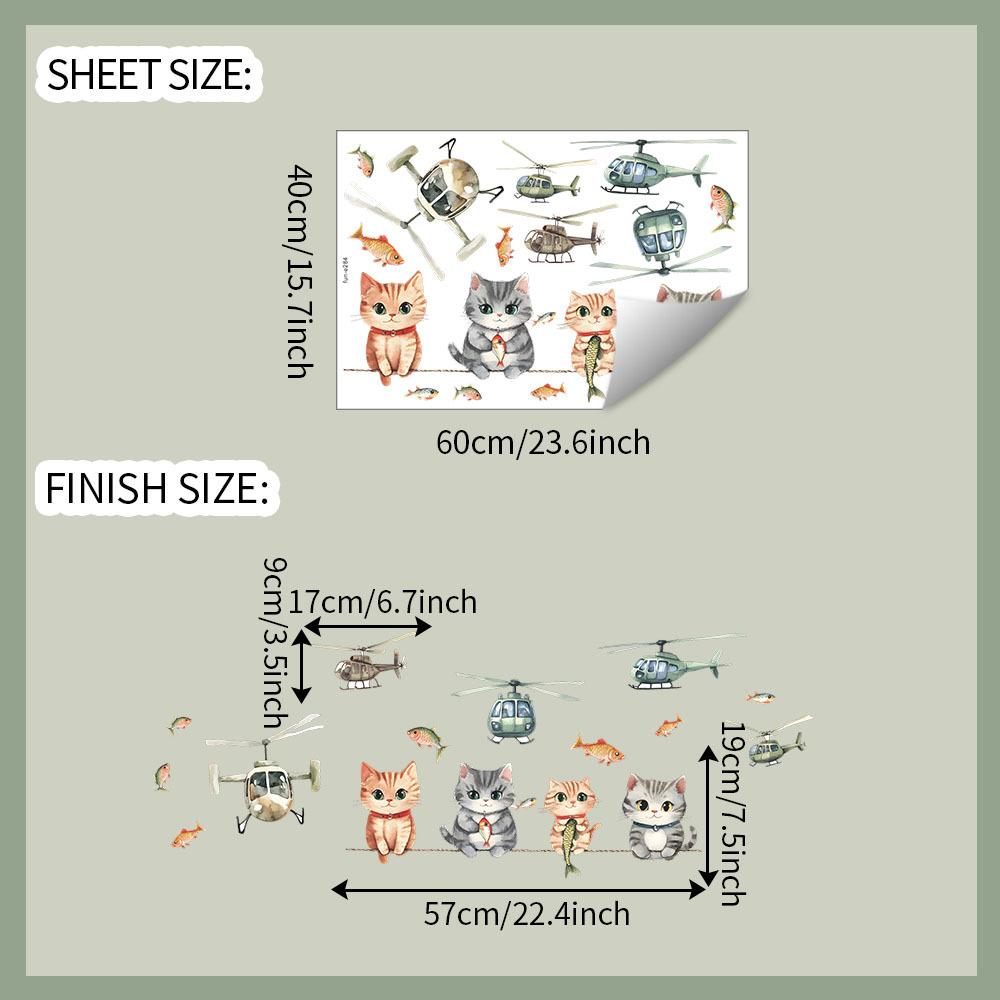 Playful Cartoon Kitten In Flying Helicopter Wall Sticker Cute Adventure Self-Adhesive Decor for Kids Room Nursery Bedroom Living Room