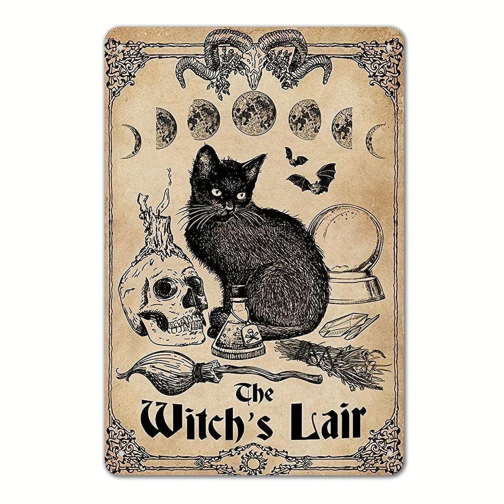 Vintage Halloween Black Cat Metal Tin Sign Gothic Witchs Lair Wall Art with Skull Crystal Ball Broomstick Design Iron