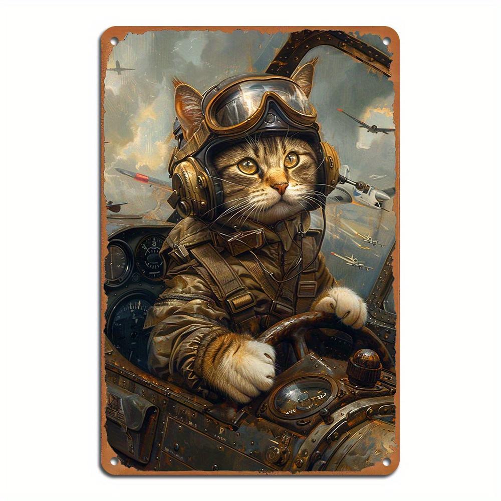 Funny Cat Pilot Aviation Themed Aluminum Tin Label Art Set Wall Decor for Home Restaurant Bar Cafe Garage Weather Resi