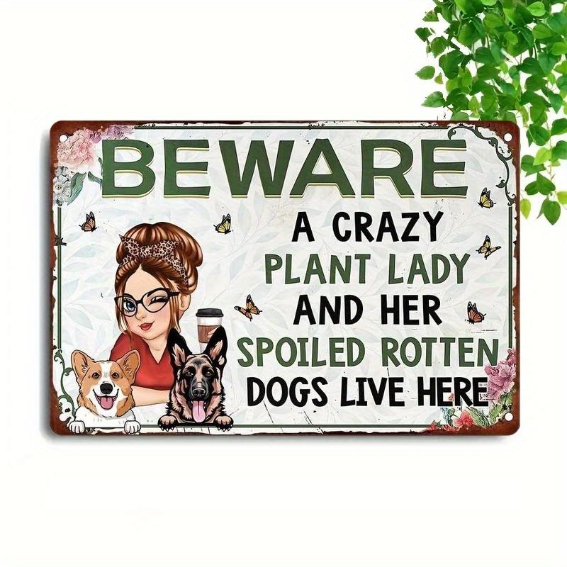 VintageStyle Metal Sign Beware of a Crazy Plant Lady and Her Spoiled Rotten Dogs Charming Wall Decor for Gardeners and Outd