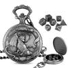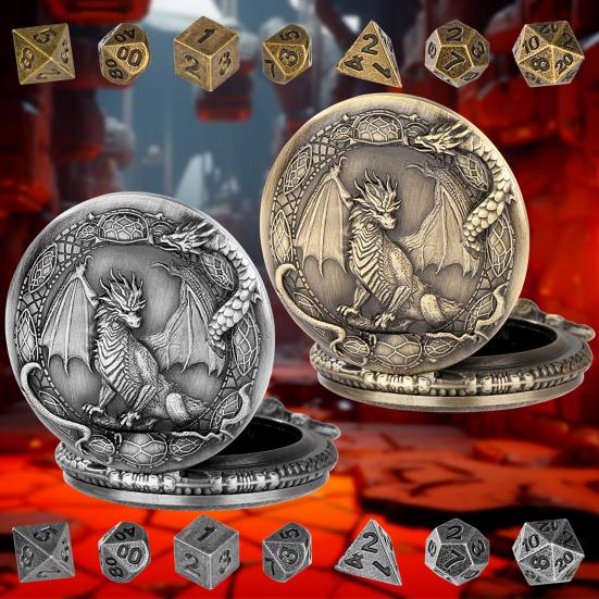 Dragon Pattern Pocket Watch Box: The dice come housed in a stylish pocket watch box adorned with an embossed dragon design on the lid. This creative packaging not only protects your dice but also adds a striking visual element that captures attention. The attached chain allows for convenient carrying or display, blending functionality with artistic flair.