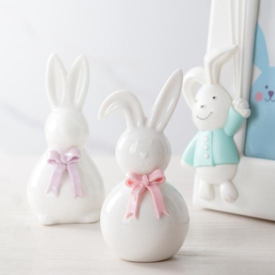This charming bunny figurine is crafted from high-quality ceramic, featuring a smooth, delicate surface with a soft luster that is durable and easy to clean. Designed to resist fading and aging, it maintains its elegant appearance over time. The two rabbits are adorned with pastel pink and lilac ribbon bows, adding a gentle, warm touch perfect for spring and Easter celebrations.