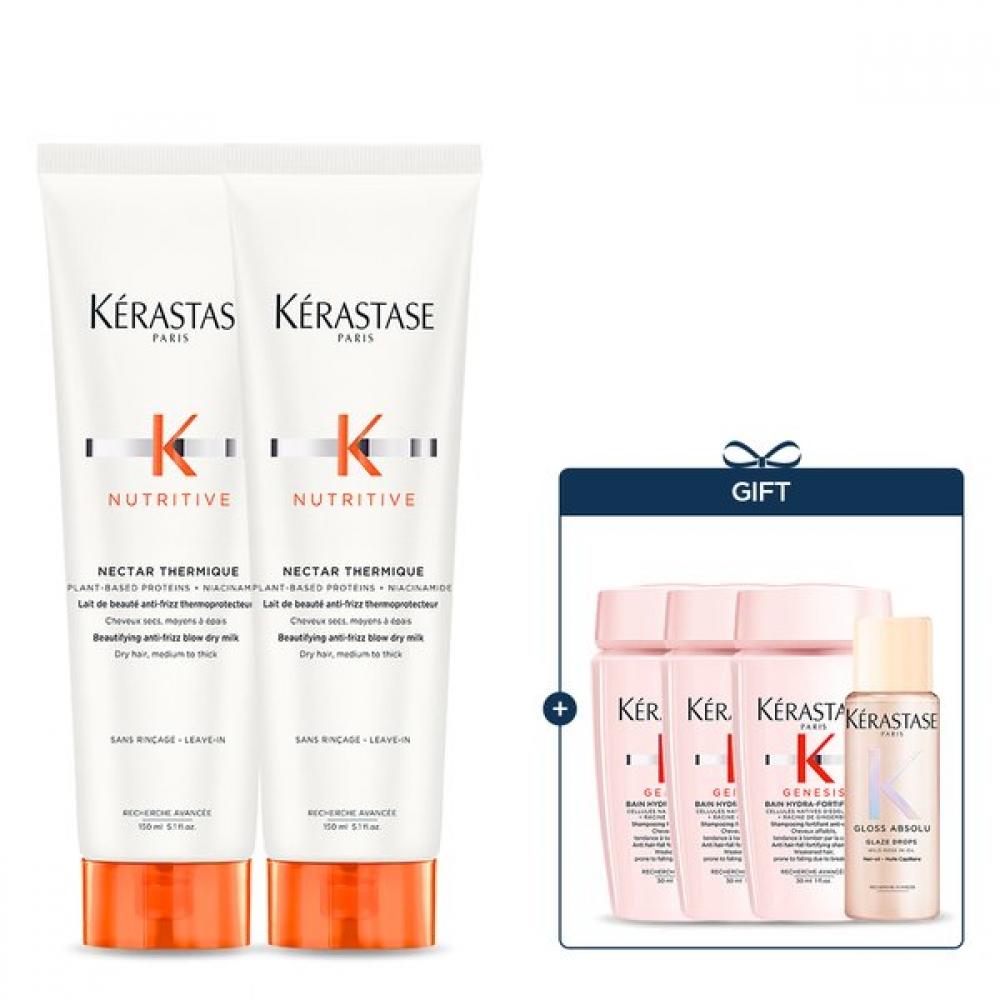 [SSG Exclusive] Duo Nutritive Nectar Thermique Heat Protecting Leave-in Treatment 150ml is a product from the Kérastase brand's Nutritive line, specifically designed for damaged and dry hair as an essence-type heat protection leave-in treatment. It nourishes from the cuticle to the inside of extremely dry and frizzy hair, providing a glossy finish, protecting from the causes of hair dryness, and preventing hair from frizzing. This treatment effectively cares for dry hair while protecting it from heat.