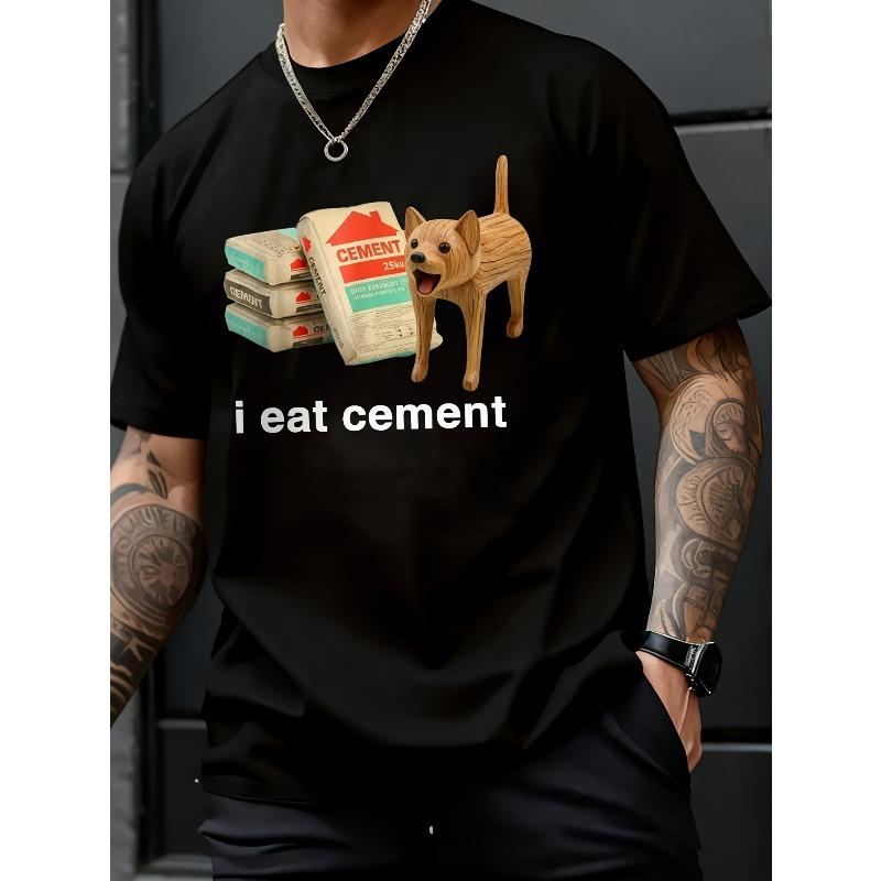 European Sizes Men's "I Eat Cement" Curse Humor T-Shirt with Cat - Funny Swearing Design, Quirky Novelty Gift, Round Neck Short Sleeve Casual Shirt