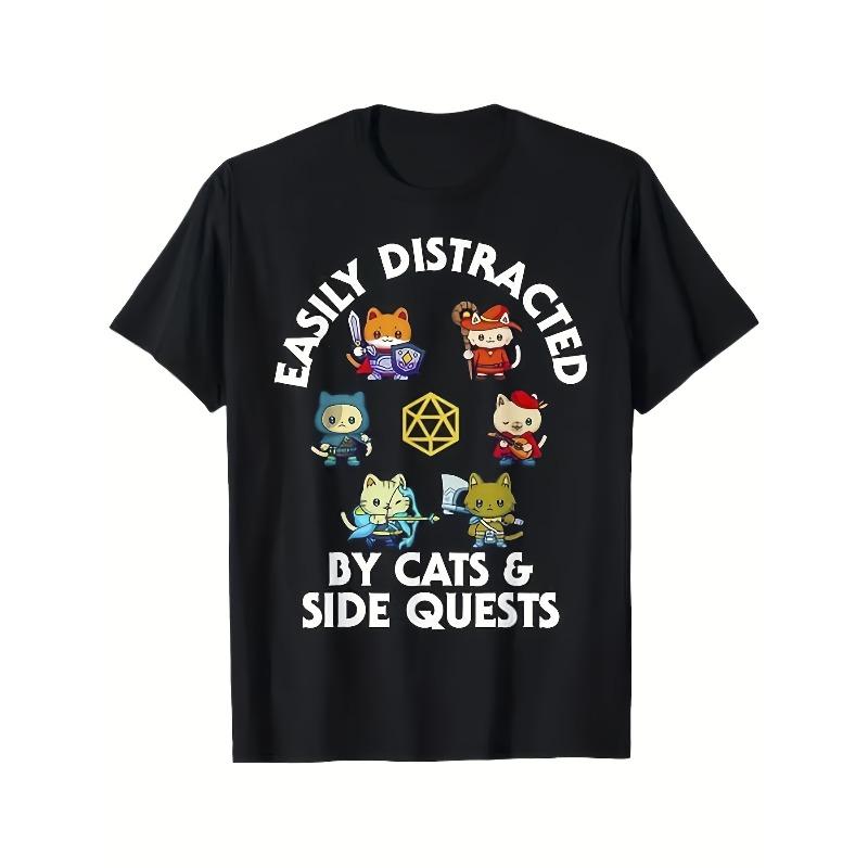 European Sizes Men's RPG D20 Dice & Cat Tabletop Gaming T-Shirt - Loose Fit Retro D&D Inspired Tee with D20 Die, Wizard