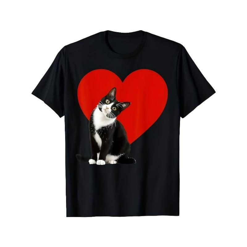 European Sizes Funny Black & Tuxedo Cat Valentine'S Day T-Shirt - Red Heart Graphic Tee, Adult Casual Crewneck Shirt