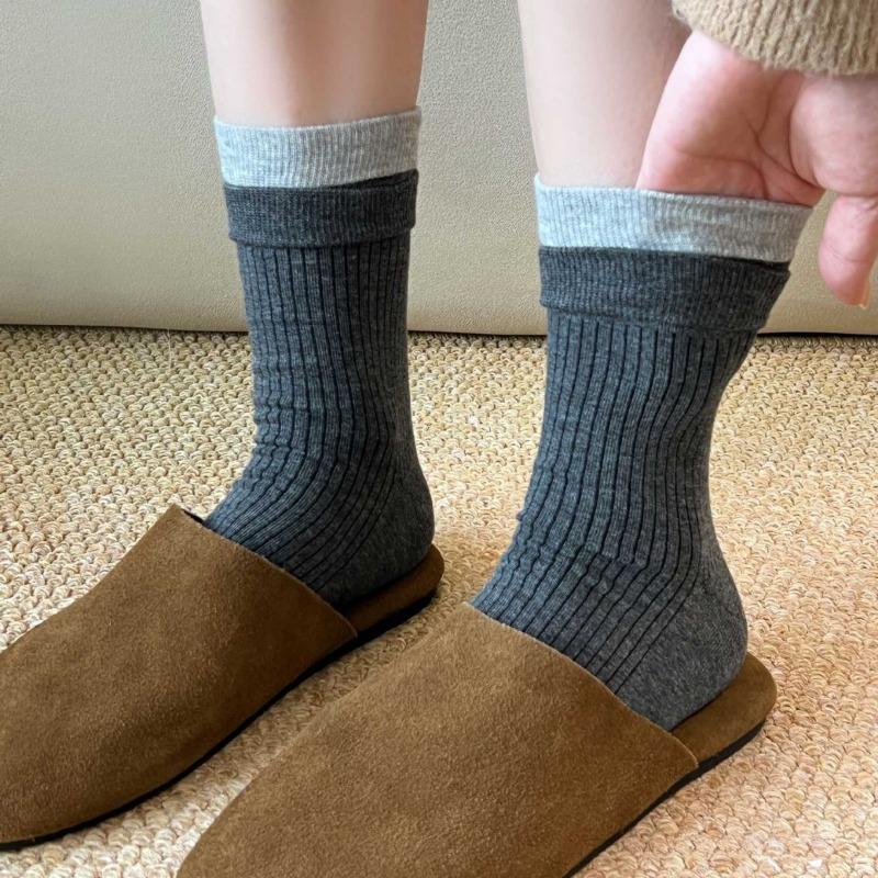 Spring and Autumn Children's Sock Set - Mid-length Double-cuffed Multi-color Plaid Socks, Gray Fake Two-piece Long Socks, Pure Cotton, Bone-free Socks