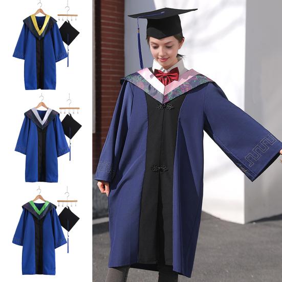 Featuring a detachable velvet school badge on the left chest and color-coded degree ribbons on the shoulder, it honors academic traditions with personalized detail. The classic three-dimensional tailoring offers long draping sleeves and a loose fit, accented by iconic tassels on cuffs and hem for an elegant look.