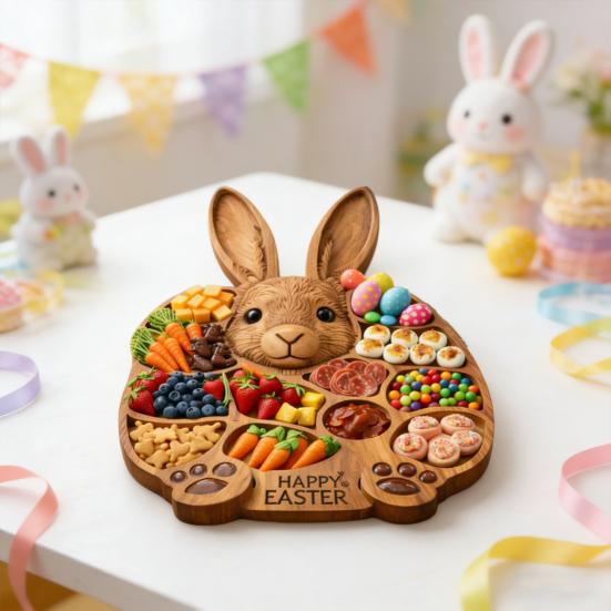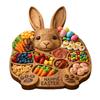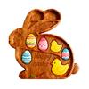 This rustic rabbit-shaped deli tray features multiple compartments to neatly separate cheese, meat, fruit, nuts, and snacks, ensuring an organized and visually appealing presentation.