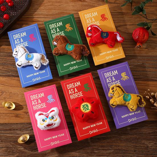 Vibrant and Diverse Design Styles: Available in six vivid colorsblue, green, orange, pink, red, and purpleeach envelope reflects unique personalities and aesthetic preferences. Printed with the inspiring English slogan "DREAM AS A HORSE" alongside the Chinese character for "horse," these designs incorporate traditional symbols like the "fa" lucky bag and lion dance to convey auspicious New Year blessings.