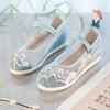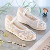 New Woman's Thick Sole Shallow Cloth Shoes Breathable Mesh Hollowed Retro Sloping Heel With Raised Embroidered Shoe Nude Shoes