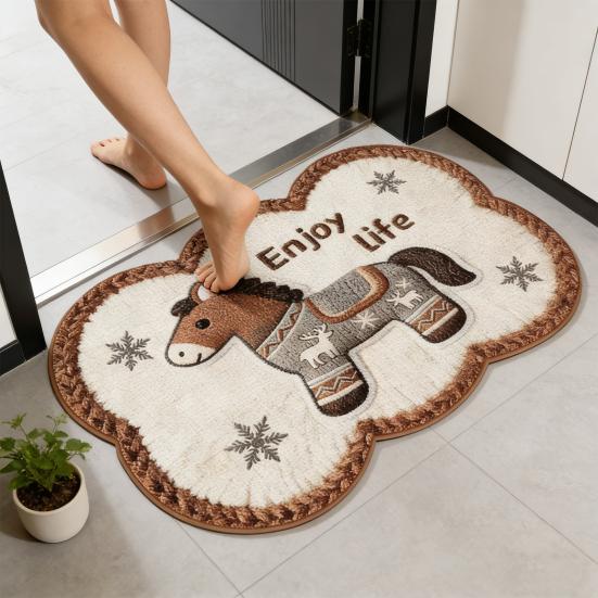 Featuring a charming cartoon horse wearing a sweater, complemented by playful words and snowflake motifs, it adds a warm and festive touch to your dcor. The anti-slip bottom with rubber or particle grip prevents shifting, enhancing safety for children and the elderly. Made from high-quality polyester fiber, it offers strong water absorption to keep floors dry, ideal for bathrooms, kitchens, and moisture-prone areas.
