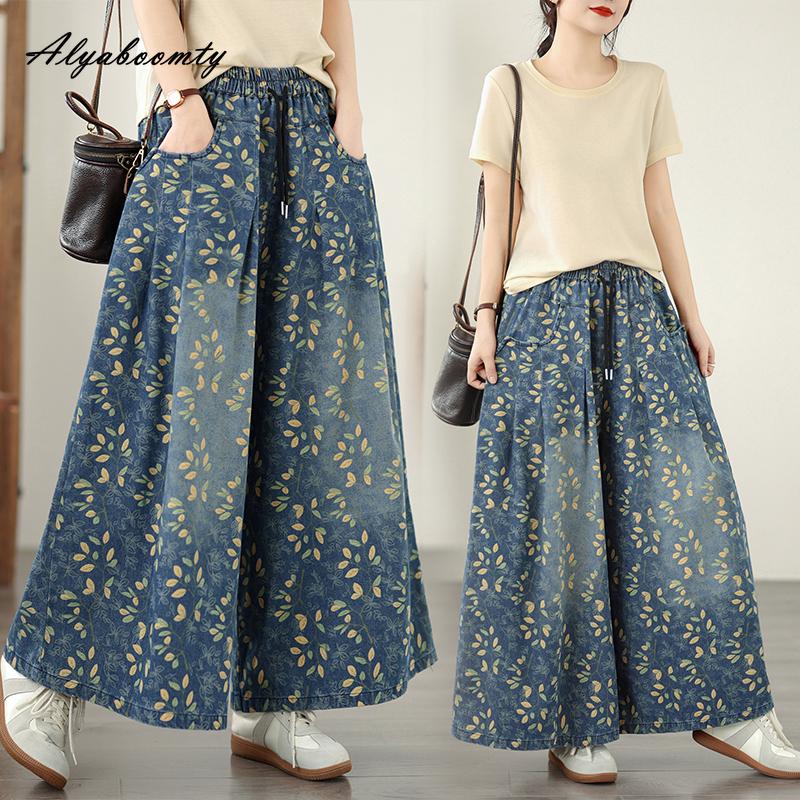 2026 Korean Fashion Spring Autumn Women Wide Leg Jeans Drawstring High Waist Floral Print Baggy Denim Pants Vintage Casual Loose Ladies' Jeans