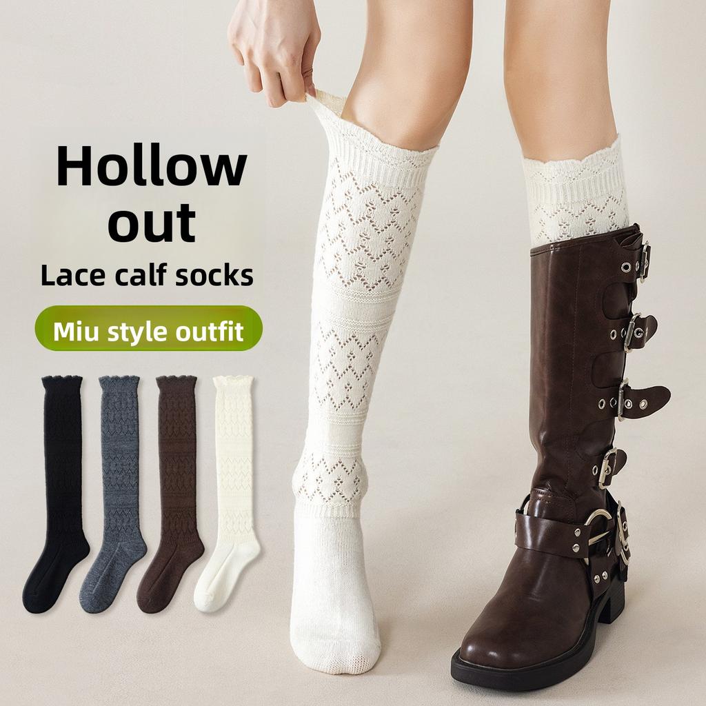 Short Leg Stockings - Autumn/Winter Style with Openwork Lace and Solid Color. Long Stockings for Girls and Women. Trendy Pile-style Stockings.