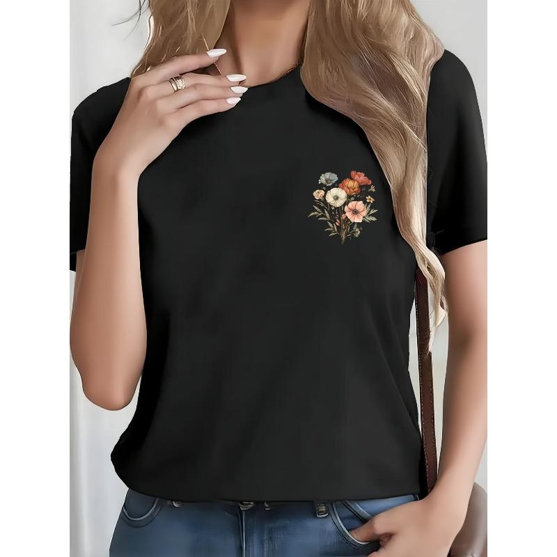 Women's Black Floral Print Tee Left Chest Design Round Neck Short Sleeve Lightweight Summer Casual Everyday Stylish Top