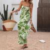 Summer New Style Vacation Fresh Trend One-piece Long Pants with High Waist and Plunging Neckline, Featuring Green Leaf Printed Design.