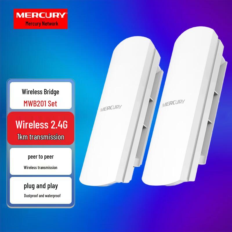 The Mercury MWB201 Wireless Surveillance Bridge Kit offers a reliable 2.4GHz point-to-point solution for long-distance network extension up to 1km. Designed for surveillance, it supports PoE/DC power and provides easy plug-and-play setup for expanding network coverage in various environments. (CN version)