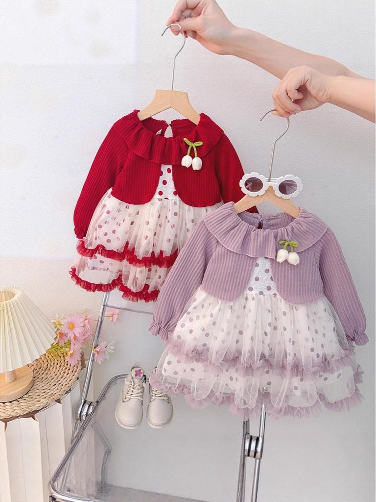 This adorable dress is perfect for your little one during the spring and autumn seasons. Crafted from soft and breathable cotton, it ensures comfort while your baby girl explores her world. The charming polka dot design adds a playful touch, complemented by the delicate tulip mesh overlay for an extra hint of elegance. Ideal for both casual outings and special occasions, this dress combines style and practicality effortlessly.