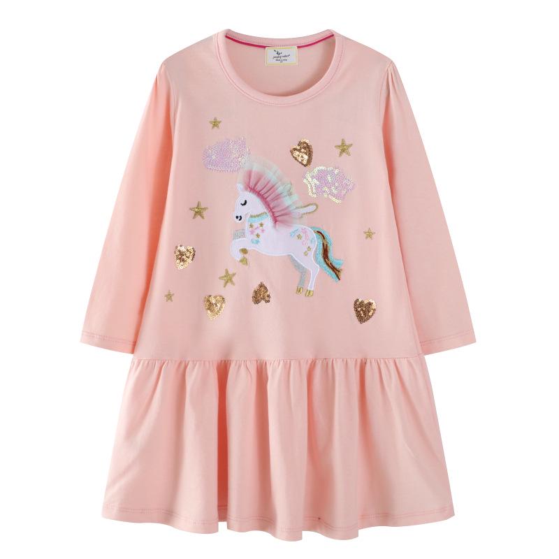 This enchanting long sleeve princess dress is perfect for young girls and features a charming unicorn embroidery, evoking the magic of a European autumn. Made from soft and comfortable cotton, this dress is gentle on the skin and ideal for cooler weather. The elegant design effortlessly combines whimsy with practicality, making it a delightful addition to any little girl's wardrobe for both casual outings and special occasions.